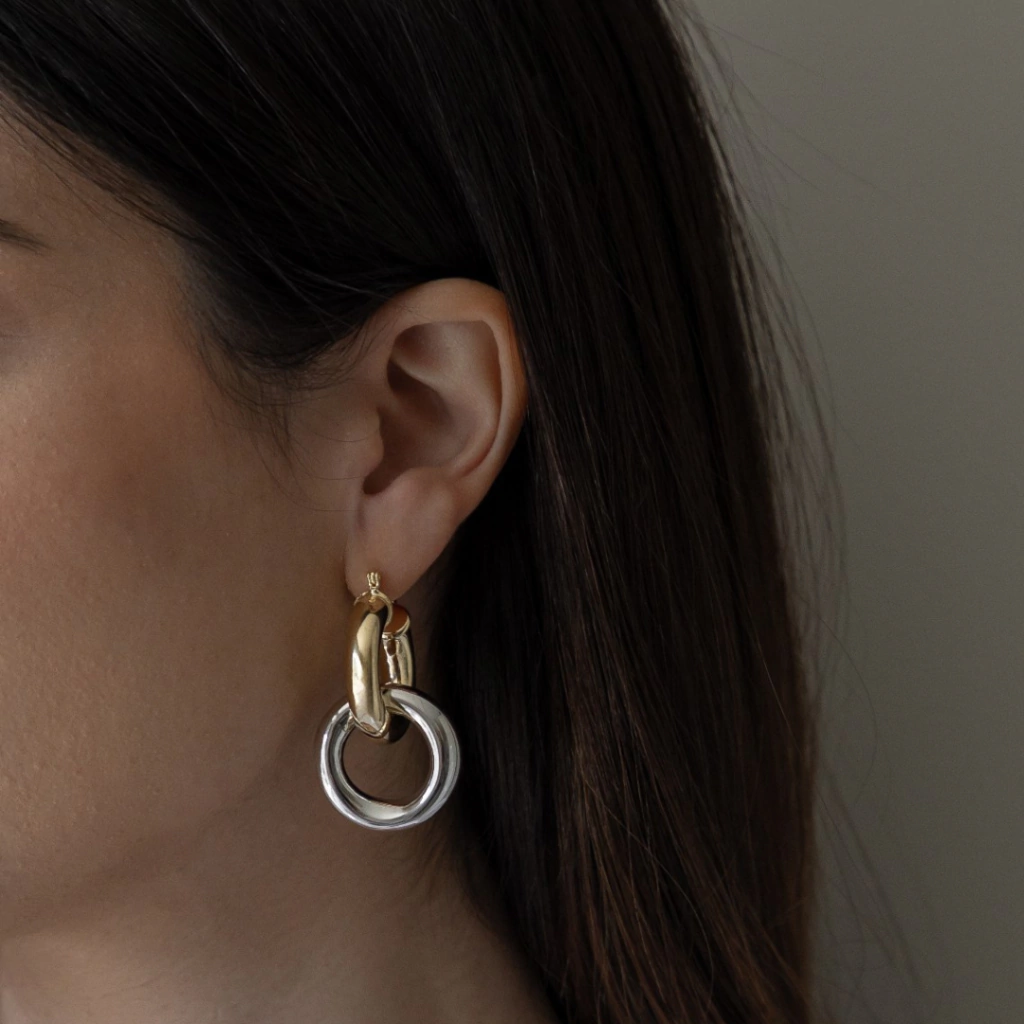 Moderno, versátil e cheio de atitude. Composto por dois aros interligados, um em banho dourado e outro em banho de ródio branco, seu design cria um contraste elegante e contemporâneo. A estrutura desmontável permite usar os aros juntos ou só a argola dourada, adaptando-se ao seu estilo e ocasião. Uma peça que transforma o clássico em inovação, perfeita para quem ama liberdade e sofisticação em cada detalhe.